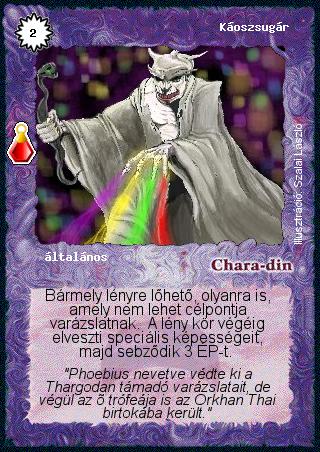 Kiadás: Esthar Császárság Gyakoriság: ritka Lapszín (isten): Chara-din Típus: általános Szöveg: Bármely lényre lőhető, olyanra is, amely nem lehet célpontja varázslatnak. A lény kör végéig elveszti speciális képességeit, majd sebződik 3 ÉP-t. Szinesítő szöveg: "Phoebius nevetve védte ki a Thargodan támadó varázslatait, de végül az ő trófeája is az Orkhan Thai birtokába került." Illusztráció: Szalai László