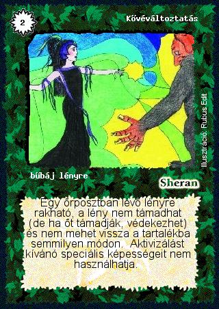 Kiadás: Alappakli, 1. kiadás, Alappakli, 2. kiadás, Alappakli, 3. kiadás, Alappakli, 4. kiadás Gyakoriság: nem gyakori Lapszín (isten): Sheran Típus: bűbáj lényre Szöveg: Egy őrposztban lévő lényre rakható, a lény nem támadhat (de ha őt támadják, védekezhet) és nem mehet vissza a tartalékba semmilyen módon. Aktivizálást kívánó speciális képességeit nem használhatja. Illusztráció: Rubus Edit