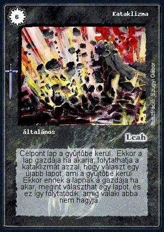 Kiadás: Alappakli, 3. kiadás, Hőskorszak Gyakoriság: ritka Lapszín (isten): Leah Típus: általános Szöveg: Célpont lap a gyűjtőbe kerül. Ekkor a lap gazdája ha akarja, folytathatja a kataklizmát azzal, hogy választ egy újabb lapot, ami a gyűjtőbe kerül. Ekkor ennek a lapnak a gazdája ha akar, megint választhat egy lapot, és ez így folytatódik, amíg valaki abba nem hagyja. Illusztráció: