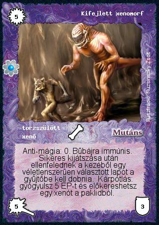 Kiadás: Rhatt fénykora Gyakoriság: nem gyakori Lapszín (isten): Mutáns Klán Típus: torzszülött Altípus: xenó Szöveg: Anti-mágia: 0. Bűbájra immúnis. Sikeres kijátszása után ellenfelednek a kezéből egy véletlenszerűen választott lapot a gyűjtőbe kell dobnia. Kárpótlás: gyógyulsz 5 ÉP-t és előkereshetsz egy xenót a paklidból. Illusztráció: Ruzsinszki Zsolt