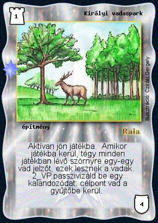 Kiadás: Ezüsthajnal, Túlélők Földje Gyakoriság: nem gyakori Lapszín (isten): Raia Típus: építmény Szöveg: Aktívan jön játékba. Amikor játékba kerül, tégy minden játékban lévő szörnyre egy-egy vad jelzőt, ezek lesznek a vadak. 2 VP,passzivizáld be egy kalandozódat: célpont vad a gyűjtőbe kerül. Illusztráció: Cziráki Gergely