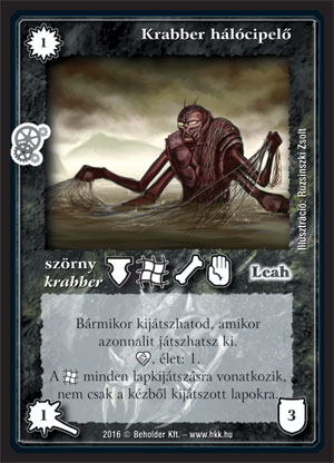 Kiadás: Kreátor műhelye Gyakoriság: nem gyakori Lapszín (isten): Leah Típus: szörny Altípus: krabber Szöveg: Bármikor kijátszhatod, amikor azonnalit játszhatsz ki. _etnikum, élet: 1. A _háló minden lapkijátszásra vonatkozik, nem csak a kézből kijátszott lapokra. Illusztráció: Ruzsinszki Zsolt