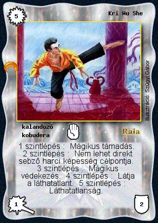 Kiadás: Chara-din visszatér Gyakoriság: ritka Lapszín (isten): Raia Típus: kalandozó Altípus: kobudera Szöveg: 1 szintlépés: Mágikus támadás. 2 szintlépés: Nem lehet direkt sebző harci képesség célpontja. 3 szintlépés: Mágikus védekezés. 4 szintlépés: Látja a láthatatlant. 5 szintlépés: Láthatatlanság. Illusztráció: