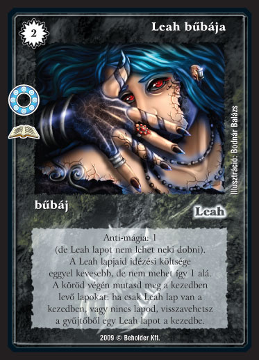 Szöveg: Anti-mágia: 1 (de Leah lapot nem lehet neki dobni). A Leah lapjaid idézési költsége eggyel kevesebb, de nem mehet így 1 alá. A köröd végén mutasd meg a kezedben levő lapokat: ha csak Leah lap van a kezedben, vagy nincs lapod, visszavehetsz a gyűjtőből egy Leah lapot a kezedbe.