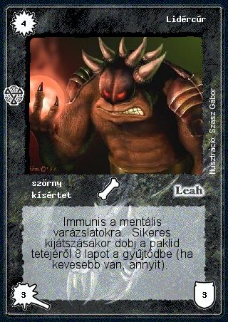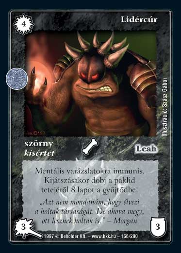 Hatalom Kártyái kártyalap - Lidércúr| (AK39) Azon lapok kijátszási feltétele, melyeket akkor játszhatok ki, ha X lapom, lényem stb. a gyűjtőbe került, csak akkor teljesül, ha ezek a lapok az asztalról kerülnek a gyűjtőbe. Ezeket a lapokat nem lehet kihozni úgy, hogy a kezemből dobom el a lapokat (pl. Savgólem), vagy a paklimból dobálok (pl. Lidércúr). | | (AK55) Ha egy Ördögi mentorral, Az angyalok háborújával vagy hasonló varázslattal több olyan lény jön játékba, amelyen a \"kijátszásakor...\" szöveg szerepel, pontosan mi történik? A lények egyszerre jönnek játékba - tehát pl. egy Notermanthi sebzése és ÉP-je nulla lesz, mivel nem lesznek lények a gyűjtőben, az egyszerre játékba jövő lények kirakása után kell az életpontot megállapítani. Majd a varázslatot kijátszó játékos által meghatározott sorrendben létrejönnek a lények kijátszáskori képességei. Dobsz lapokat a Lidércúrnak, lényt pusztít a Lohd Haven sáhkánya, áldozásra kényszerít Helvir stb. Másik példa, amikor valaki Terccel kirak három Lohd Haven sáhkányát. A fentiek alapján a sárkányok egyszerre jönnek ki, de a hatásuk sorban hajtódik végre. Az első sárkány leszed két lapot, majd a második sárkány stb. Ha egy galetkin négy testrész van, akkor is el tudják pusztítani, hiszen az első két sárkány a végtagokat szedi le. |