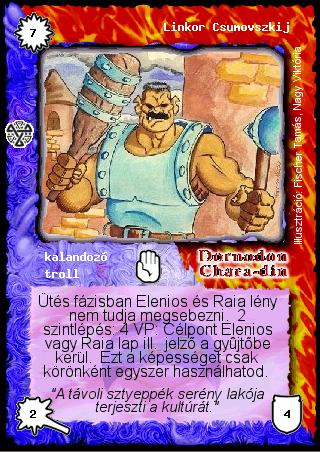 Szöveg: Ütés fázisban Elenios és Raia lény nem tudja megsebezni. 2 szintlépés: 4 VP: Célpont Elenios vagy Raia lap ill. jelző a gyűjtőbe kerül. Ezt a képességet csak körönként egyszer használhatod.
