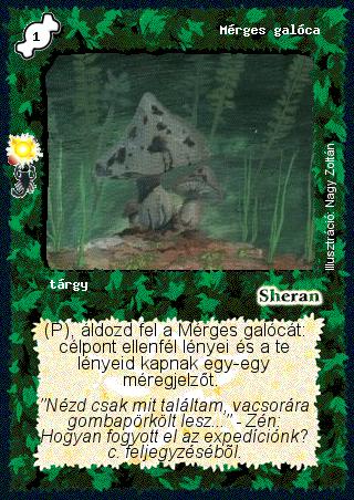 Szöveg: (P), áldozd fel a Mérges galócát: célpont ellenfél lényei és a te lényeid kapnak egy-egy méregjelzőt.