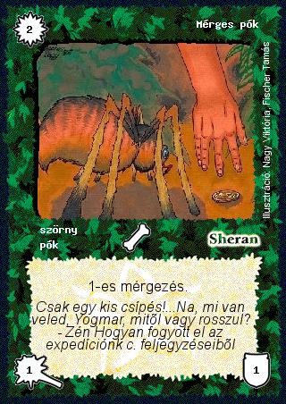 Kiadás: Alappakli, 1. kiadás, Alappakli, 2. kiadás, Alappakli, 3. kiadás, Alappakli, 4. kiadás Gyakoriság: gyakori Lapszín (isten): Sheran Típus: szörny Altípus: pók Szöveg: 1-es mérgezés. Szinesítő szöveg: Csak egy kis csípés!...Na, mi van veled, Yogmar, mitől vagy rosszul? - Zén Hogyan fogyott el az expedíciónk c. feljegyzéseiből Illusztráció: Nagy Viktória, Fischer Tamás