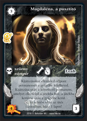 Kiadás: Kreátor műhelye Gyakoriság: ritka Lapszín (isten): Leah Típus: szörny Altípus: vámpír Szöveg: Kijátszásakor ellenfeled célpont permanensét a gyűjtőbe küldheted. Kijátszása után a következő permanens, amelyet ellenfeled a játékba hoz, a játékba kerülése után a gyűjtőbe kerül. (S), ha sebzést okoz az ütés fázisodban, húzz 1 lapot! Illusztráció: Bodnár Balázs