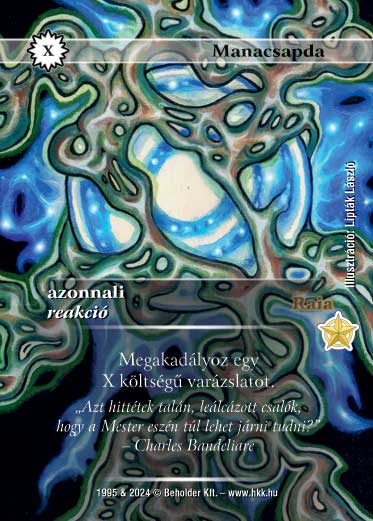 Kiadás: Alappakli, 3. kiadás, Alappakli, 4. kiadás, Hőskorszak, Promóciós lapok (2024) Gyakoriság: gyakori Lapszín (isten): Raia Típus: azonnali Szöveg: Közvetlenül egy varázslat kijátszása után használhatod. El kell költened annyi VP-t, amennyi a célpont varázslat módosított idézési költsége volt. Célpont varázslat nem jön létre, csak a gyűjtőbe kerül. Szinesítő szöveg: "Azt hittétek talán, leálcázott csalók hogy a Mester eszén túl lehet járni tudni?" - Charles Bandelaire Illusztráció: Lipták László
