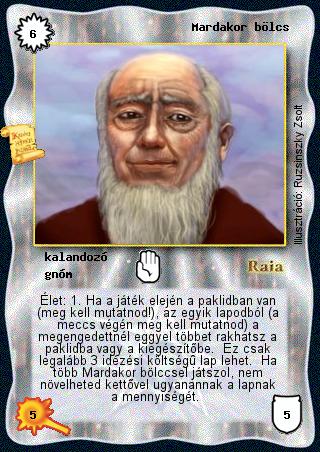 Szöveg: Élet: 1. Ha a játék elején a paklidban van (meg kell mutatnod!), az egyik lapodból (a meccs végén meg kell mutatnod) a megengedettnél eggyel többet rakhatsz a paklidba vagy a kiegészítőbe. Ez csak legalább 3 idézési költségű lap lehet. Ha több Mardakor bölccsel játszol, nem növelheted kettővel ugyanannak a lapnak a mennyiségét.