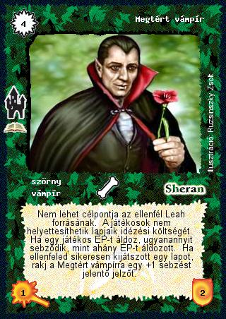 Szöveg: Nem lehet célpontja az ellenfél Leah forrásának. A játékosok nem helyettesíthetik lapjaik idézési költségét. Ha egy játékos ÉP-t áldoz, ugyanannyit sebződik, mint ahány ÉP-t áldozott. Ha ellenfeled sikeresen kijátszott egy lapot, rakj a Megtért vámpírra egy +1 sebzést jelentő jelzőt.