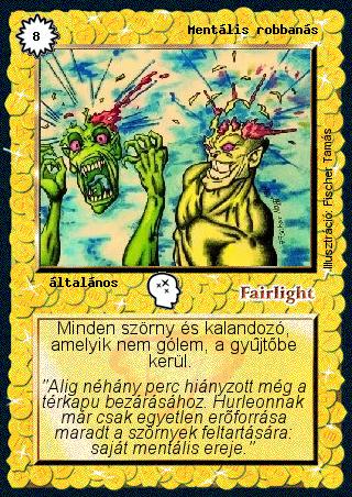 Kiadás: Alappakli, 4. kiadás, Túlélők Földje Gyakoriság: ritka Lapszín (isten): Fairlight Típus: általános Szöveg: Minden szörny és kalandozó, amelyik nem gólem, a gyűjtőbe kerül. Szinesítő szöveg: "Alig néhány perc hiányzott még a térkapu bezárásához. Hurleonnak már csak egyetlen erőforrása maradt a szörnyek feltartására: saját mentális ereje." Illusztráció: Fischer Tamás