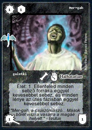 Kiadás: Sárkánymágia Gyakoriság: nem gyakori Lapszín (isten): Halhatatlan Klán Típus: galetki Szöveg: Élet: 1. Ellenfeled minden sebző forrása eggyel kevesebbet sebez, és minden lénye az ütés fázisban eggyel kevesebbet sebez. Szinesítő szöveg: "Mer-gah, a csúszómászó... Mások bőrét viszi a vásárra a magáé helyett." - Brutus Illusztráció: Baross Ferenc