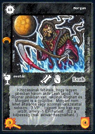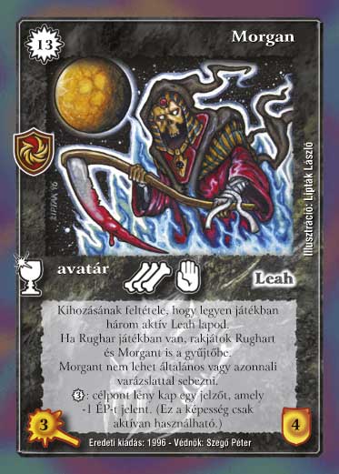 Kiadás: Chara-din visszatér, Védnök 2021 Gyakoriság: ritka Lapszín (isten): Leah Típus: avatár Szöveg: Kihozásának feltétele, hogy legyen játékban három aktív Leah lapod. Ha Rughar játékban van, rakjátok Rughart és Morgant is a gyűjtőbe. Morgant nem lehet általános vagy azonnali varázslattal sebezni. 3 VP: célpont lény kap egy jelzőt, amely -1 ÉP-t jelent. (Ez a képesség csak aktívan használható. ). Illusztráció: Lipták László