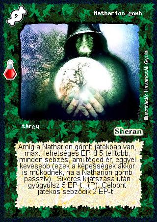 Szöveg: Amíg a Natharion gömb játékban van, max. lehetséges ÉP-d 5-tel több, minden sebzés, ami téged ér, eggyel kevesebb (ezek a képességek akkor is működnek, ha a Natharion gömb passzív). Sikeres kijátszása után gyógyulsz 5 ÉP-t. (P): Célpont játékos sebződik 2 ÉP-t.