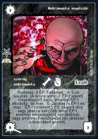 Kiadás: Nekromanta szentély (Zén) Gyakoriság: ritka Lapszín (isten): Leah Típus: szörny Altípus: nekromanta Szöveg: Büntetés: 4 ÉP. Feltámad. +: 5-ös öregítés. (A lényre annyi -1 ÉP-t jelentő öregedésjelző kerül, amennyi VP-t elköltesz, de max. 5. Játékoson ÉP-t és max. ÉP-t csökkent.) (P): célpont lény vagy játékos sebződik annyi ÉP-t, amennyi öregedésjelző van játékban, vagy amennyi nekromantád van játékban (választásod szerint). Illusztráció: Bride