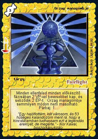 Kiadás: Múltidéző, Alappakli, 8. kiadás Gyakoriság: ritka Lapszín (isten): Fairlight Típus: tárgy Szöveg: Minden ellenfeled minden előkészítő fázisában 2 VP-vel kevesebbet kap, és sebződik 2 ÉP-t. Orzag managömbje semmilyen módon nem másolható. Párbaj: 1. Szinesítő szöveg: "Egy hajóflottám, két városom, és 53 hűséges kalandozóm ment rá, hogy a kincstáramban tudhassam ezt a legendás ereklyét, de megérte." - Nor Kawai, boszorkánykirály Illusztráció: Lipták László