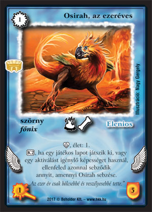 Kiadás: Alanori Olimpia Gyakoriság: ritka Lapszín (isten): Elenios Típus: szörny Altípus: főnix Szöveg: _etnikum, élet: 1. (K2), ha egy játékos lapot játszik ki vagy használ egy aktiválást igénylő képességet, ellenfeled azonnal sebződik annyit, amennyi Osirah sebzése. Szinesítő szöveg: "Az ezer év csak bölcsebbé és veszélyesebbé tette." Illusztráció: Nagy Gergely