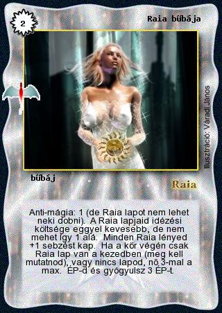 Szöveg: Anti-mágia: 1 (de Raia lapot nem lehet neki dobni). A Raia lapjaid idézési költsége eggyel kevesebb, de nem mehet így 1 alá. Minden Raia lényed +1 sebzést kap. Ha a kör végén csak Raia lap van a kezedben (meg kell mutatnod), vagy nincs lapod, nő 3-mal a max. ÉP-d és gyógyulsz 3 ÉP-t.