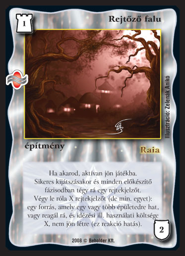 Szöveg: Ha akarod, aktívan jön játékba. Sikeres kijátszásakor és minden el?készít? fázisodban tégy rá egy rejtekjelz?t. Végy le róla X rejtekjelz?t (de min. egyet): egy forrás, amely egy vagy több épületedre hat, vagy reagál rá, és idézési ill. használati költsége X, nem jön létre (ez reakció hatás).