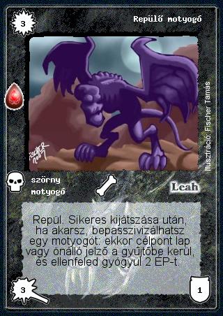 Kiadás: Zu'lit kincse Gyakoriság: gyakori Lapszín (isten): Leah Típus: szörny Altípus: motyogó Szöveg: Repül. Sikeres kijátszása után, ha akarsz, bepasszivizálhatsz egy motyogót: ekkor célpont lap vagy önálló jelző a gyűjtőbe kerül, és ellenfeled gyógyul 2 ÉP-t. Illusztráció: Fischer Tamás