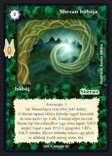 Szöveg: Anti-mágia: 1 (de Sheran lapot nem lehet neki dobni). A Sheran lapjaid idézési költsége eggyel kevesebb, de nem mehet így 1 alá. A köröd végén ha csak Sheran lap van a kezedben vagy nincs lapod, vagy megnő 3-mal a max. ÉP-d és gyógyulsz 3 ÉP-t, VAGY minden Sheran lényedre tehetsz egy jelzőt az alábbiak közül: méreg, izom, élet.