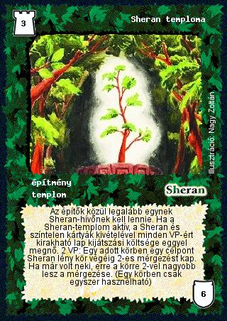 Kiadás: Alappakli, 1. kiadás, Alappakli, 2. kiadás, Alappakli, 3. kiadás Gyakoriság: ritka Lapszín (isten): Sheran Típus: építmény Altípus: templom Szöveg: Az építők közül legalább egynek Sheran-hívőnek kell lennie. Ha a Sheran-templom aktív, a Sheran és színtelen kártyák kivételével minden VP-ért kirakható lap kijátszási költsége eggyel megnő. 2 VP: Egy adott körben egy célpont Sheran lény kör végéig 2-es mérgezést kap. Ha már volt neki, erre a körre 2-vel nagyobb lesz a mérgezése. (Egy körben csak egyszer hasznélható) Illusztráció: Nagy Zoltán