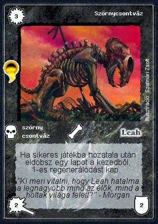 Kiadás: Aranyforrás, Túlélők Földje Gyakoriság: gyakori Lapszín (isten): Leah Típus: szörny Altípus: csontváz Szöveg: Ha sikeres játékba hozatala után eldobsz egy lapot a kezedből, 1-es regenerálódást kap. Szinesítő szöveg: "Ki meri vitatni, hogy Leah hatalma a legnagyobb mind az élők, mind a holtak világa felett?" - Morgan Illusztráció: Szatmári Zsolt