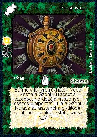 Kiadás: Vízöntő (Csillagképek) Gyakoriság: ritka Lapszín (isten): Sheran Típus: tárgy Szöveg: Bármely lényre rakható. Vedd vissza a Szent Kulacsot a kezedbe: hordozója visszanyeri összes életpontját. Ha a Szent Kulacs az asztalról a gyűjtőbe kerül (nem feláldozástól), kapsz 5 VP-t. Illusztráció: Lexa Klára