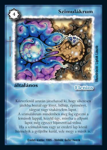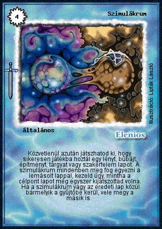 Szöveg: Közvetlenül azután játszhatod ki, hogy sikeresen játékba hoztál egy lényt, bűbájt, építményt, tárgyat vagy szakértelem lapot. A szimulákrum mindenben meg fog egyezni a lemásolt lappal, kezeld úgy, mintha a célpont lapot még egyszer kijátszottad volna. Ha a szimulákrum vagy az eredeti lap közül bármelyik a gyűjtőbe kerül, vele megy a másik is.