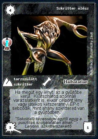 Kiadás: Ébredés Gyakoriság: gyakori Lapszín (isten): Halhatatlan Klán Típus: torzszülött Altípus: szkritter Szöveg: Ha megüt egy lényt, az a gyűjtőbe kerül. Kijátszhatod azonnali varázslatként is, ekkor célpont lény vagy játékos kétszerannyi ÉP-t sebződik, mint ahány szkrittered van a gyűjtődben. Szinesítő szöveg: "Sokoldalú képességei egytől egyig a pusztítás szolgálatában állnak." - Laryonn, szkritterszakértő Illusztráció: Ruzsinszki Zsolt