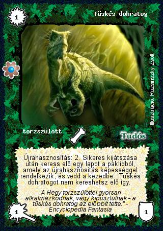 Kiadás: Rhatt fénykora Gyakoriság: gyakori Lapszín (isten): Tudós Klán Típus: torzszülött Szöveg: Újrahasznosítás: 2. Sikeres kijátszása után keress elő egy lapot a paklidból, amely az újrahasznosítás képességgel rendelkezik, és vedd a kezedbe. Tüskés dohratogot nem kereshetsz elő így. Szinesítő szöveg: "A Hegy torzszülöttei gyorsan alkalmazkodnak, vagy kipusztulnak - a tüskés dohratog az előbbit tette." - Encyclopedia Fantasia Illusztráció: Ruzsinszki Zsolt