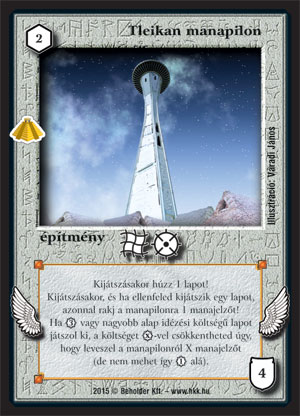 Szöveg: Kijátszásakor húzz 1 lapot! Kijátszásakor, és ha ellenfeled kijátszik egy lapot, azonnal rakj a manapilonra 1 manajelzőt! Ha 3_VP vagy nagyobb alap idézési költségű lapot játszol ki, a költséget X_VP-vel csökkentheted úgy, hogy leveszel a manapilonról X manajelzőt (de nem mehet így 1_VP alá).