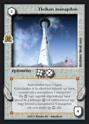 | Az, hogy bizonyos lapok költségét fizethetem a Tleikan manapilonon ill. a Vlagyimir ónixpiramisán levő jelzők levételével is, egy állandóan működő képesség, nem pedig aktiválást igénylő. | | Nem olcsóbbítja a Tleikan manapilon a vegyes idézési költségű lapokat, mivel a szövegben a 3 a varázspont ikonban szerepel. (Hasonló a helyzet mint pl. az Eldüeni vándornál.) A zanszilánk varázspont költségnek számít minden szempontból, ezért az idézési költségben varázspontot és zanszilánkot vegyesen tartalmazó lapokat olcsóbbítja (ld. Kódex 7.6.1.), de pl. a VP + nekron lapokat nem (még azokat, amelyeknél az idézési költség varázspont része 3, vagy több). |