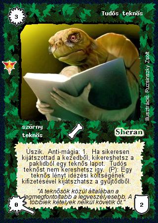 Szöveg: Úszik. Anti-mágia: 1. Ha sikeresen kijátszottad a kezedből, kikereshetsz a paklidból egy teknős lapot. Tudós teknőst nem kereshetsz igy. (P): Egy teknős lényt idézési költségének kifizetésével kijátszhatsz a gyűjtődből.