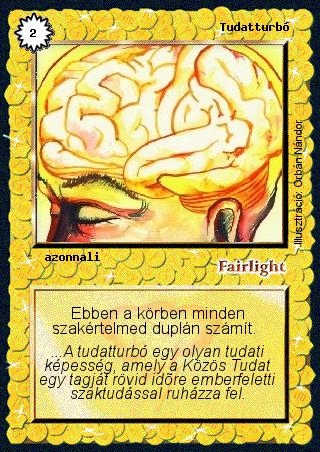Kiadás: Alappakli, 1. kiadás, Alappakli, 2. kiadás, Alappakli, 3. kiadás, Alappakli, 4. kiadás Gyakoriság: nem gyakori Lapszín (isten): Fairlight Típus: azonnali Szöveg: Ebben a körben minden szakértelmed duplán számít. Szinesítő szöveg: ...A tudatturbó egy olyan tudati képesség, amely a Közös Tudat egy tagját rövid időre emberfeletti szaktudással ruházza fel. Illusztráció: Orbán Nándor