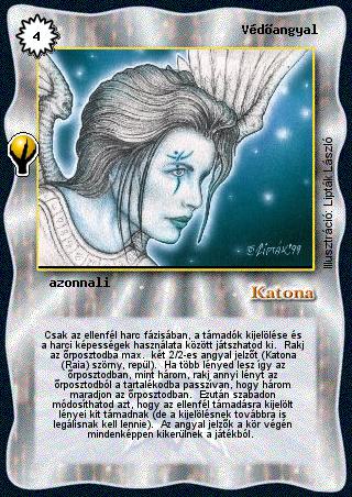 Kiadás: Alappakli, 5. kiadás (Ősök városa) Gyakoriság: ritka Lapszín (isten): Katona Klán Típus: azonnali Szöveg: Csak az ellenfél harc fázisában, a támadók kijelölése és a harci képességek használata között játszhatod ki. Rakj az őrposztodba max. két 2/2-es angyal jelzőt (Katona (Raia) szörny, repül). Ha több lényed lesz így az őrposztodban, mint három, rakj annyi lényt az őrposztodból a tartalékodba passzívan, hogy három maradjon az őrposztodban. Ezután szabadon módosíthatod azt, hogy az ellenfél támadásra kijelölt lényei kit támadnak (de a kijelölésnek továbbra is legálisnak kell lennie). Az angyal jelzők a kör végén mindenképpen kikerülnek a játékból. Illusztráció: Lipták László