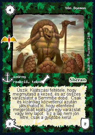 Kiadás: Sárkánymágia Gyakoriság: ritka Lapszín (isten): Sheran Típus: szörny Altípus: reakció, teknős Szöveg: Úszik. Kijátszási feltétele, hogy megmutasd a kezed, és az összes varázslatot a Semmibe dobd. Csak és kizárólag közvetlenül azután játszhatod ki, hogy ellenfeled megpróbált kijátszani egy varázslat vagy lény lapot. Ez a lap nem jön létre, csak a gyűjtőbe kerül. Illusztráció: Ruzsinszki Zsolt