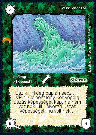 Kiadás: Chara-din visszatér Gyakoriság: nem gyakori Lapszín (isten): Sheran Típus: szörny Altípus: elementál Szöveg: Úszik. Hideg duplán sebzi. 1 VP: Célpont lény kör végéig úszás képességet kap, ha nem volt neki, ill. elveszti úszás képességét, ha volt neki. Illusztráció: Fischer Tamás, Nagy Viktória