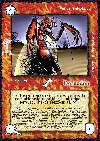 Kiadás: Árnyékvölgy (Zén) Gyakoriság: ritka Lapszín (isten): Dornodon Típus: szörny Szöveg: +: 1-es energiatüske. Ha a vörös rakolits nem áldozástól a gyűjtőbe kerül, célpont lény vagy játékos sebződik 3 ÉP-t. Szinesítő szöveg: "Ugbur egymaga szállt szembe a dűne alól előbukkanó borzadállyal. Mesterfokú kardforgató lévén, egy pillanat alatt végzett a szörnyeteggel. Ekkor azonban, legnagyobb megdöbbenésünkre, a tetem szétrobbant, darabokra szaggatva Ugburt." - Zén: Hogyan fogyott el a második expedíciónk is c. feljegyzéseiből Illusztráció: Havancsák Gyula