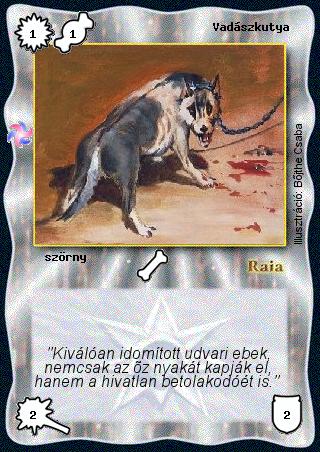 Kiadás: Létsíkok Gyakoriság: gyakori Lapszín (isten): Raia Típus: szörny Szinesítő szöveg: "Kiválóan idomított udvari ebek, nemcsak az őz nyakát kapják el, hanem a hivatlan betolakodóét is." Illusztráció: Bőjthe Csaba