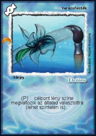Kiadás: Chara-din visszatér Gyakoriság: nem gyakori Lapszín (isten): Elenios Típus: tárgy Szöveg: (P): célpont lény színe megváltozik az általad választottra (lehet színtelen is). Illusztráció: Mojzer Krisztina