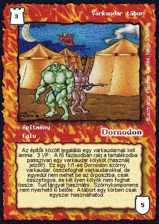 Kiadás: Chara-din visszatér Gyakoriság: nem gyakori Lapszín (isten): Dornodon Típus: építmény Altípus: falu Szöveg: Az építők között legalább egy varkaudarnak kell lennie. 3 VP: A fő fázisodban rakj a tartalékodba passzívan egy varkaudar kölyköt (használj jelzőt!). Ez egy 1/1-es Dornodon szörny, varkaudar, összefoghat varkaudarokkal, de egyedül nem mehet be az őrposztba, csak összefogva, és két ilyen kölyök nem foghat össze. Tud tárgyat használni. Szörnykomponens nem nyerhető ki belőle. A tábort egy körben csak egyszer használhatod. Illusztráció: Fischer Tamás, Nagy Viktória
