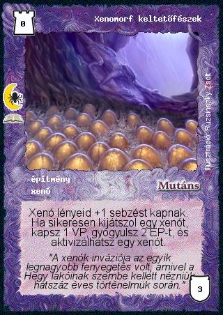 Kiadás: Végzetes utazás (Zén) Gyakoriság: ritka Lapszín (isten): Mutáns Klán Típus: építmény Altípus: xenó Szöveg: Xenó lényeid +1 sebzést kapnak. Ha sikeresen kijátszol egy xenót, kapsz 1 VP, gyógyulsz 2 ÉP-t, és aktivizálhatsz egy xenót. Szinesítő szöveg: "A xenók inváziója az egyik legnagyobb fenyegetés volt, amivel a Hegy lakóinak szembe kellett nézniük hatszáz éves történelmük során." Illusztráció: Ruzsinszki Zsolt