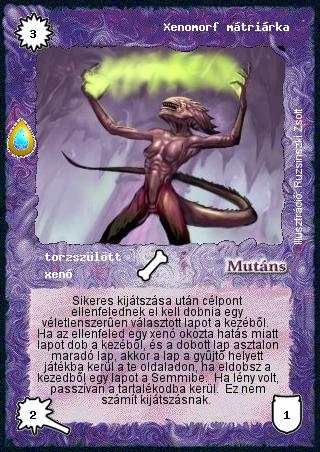 Kiadás: Zu'lit kincse Gyakoriság: ritka Lapszín (isten): Mutáns Klán Típus: torzszülött Altípus: xenó Szöveg: Sikeres kijátszása után célpont ellenfelednek el kell dobnia egy véletlenszerűen választott lapot a kezéből. Ha az ellenfeled egy xenó okozta hatás miatt lapot dob a kezéből, és a dobott lap asztalon maradó lap, akkor a lap a gyűjtő helyett játékba kerül a te oldaladon, ha eldobsz a kezedből egy lapot a Semmibe. Ha lény volt, passzívan a tartalékodba kerül. Ez nem számít kijátszásnak. Illusztráció: Ruzsinszki Zsolt