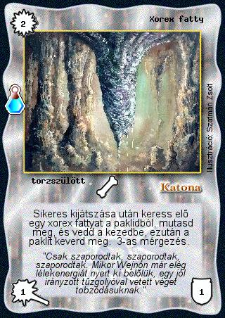 Kiadás: Esthar Császárság, Alappakli, 7. kiadás (Ősök Városa) Gyakoriság: gyakori Lapszín (isten): Katona Klán Típus: torzszülött Szöveg: Sikeres kijátszása után keress elő egy xorex fattyat a paklidból, mutasd meg, és vedd a kezedbe, ezután a paklit keverd meg. 3-as mérgezés. Szinesítő szöveg: "Csak szaporodtak, szaporodtak, szaporodtak. Mikor Wejnön már elég lélekenergiát nyert ki belőlük, egy jól irányzott tűzgolyóval vetett véget tobzódásuknak." Illusztráció: Szatmári Zsolt