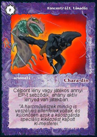 Kiadás: Alanori Krónika Gyakoriság: ritka Lapszín (isten): Chara-din Típus: azonnali Szöveg: Célpont lény vagy játékos annyi ÉP-t sebződik, ahány aktív lényed van játékban. Szinesítő szöveg: "A harcművészek mindig is veszélyes ellenfelek voltak, és különösen azok a káoszgárda speciális kiképzést kapott kí-mesterei." Illusztráció: