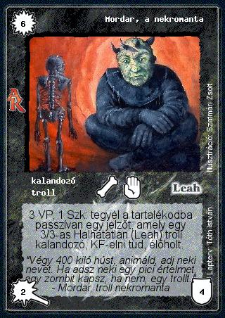 Kiadás: Alanori Krónika Gyakoriság: ritka Lapszín (isten): Leah Típus: kalandozó Altípus: troll Szöveg: 3 VP, 1 Szk: tegyél a tartalékodba passzívan egy jelzőt, amely egy 3/3-as Halhatatlan (Leah) troll kalandozó, KF-elni tud, élőholt. Szinesítő szöveg: "Végy 400 kiló húst, animáld, adj neki nevet. Ha adsz neki egy pici értelmet, egy zombit kapsz, ha nem, egy trollt." - Mordar, troll nekromanta Illusztráció: Szatmári Zsolt Tervező: Tóth István