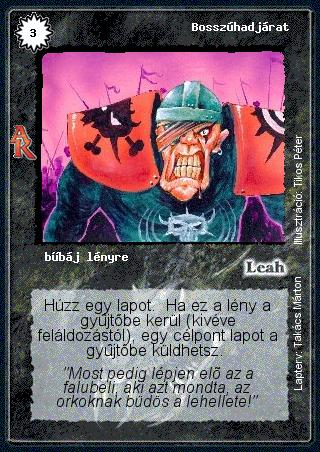 Kiadás: Alanori Krónika Gyakoriság: ritka Lapszín (isten): Leah Típus: bűbáj lényre Szöveg: Húzz egy lapot. Ha ez a lény a gyűjtőbe kerül (kivéve feláldozástól), egy célpont lapot a gyűjtőbe küldhetsz. Szinesítő szöveg: "Most pedig lépjen elő az a falubeli, aki azt mondta, az orkoknak büdös a lehellete!" Illusztráció: Tikos Péter Tervező: Takács Márton